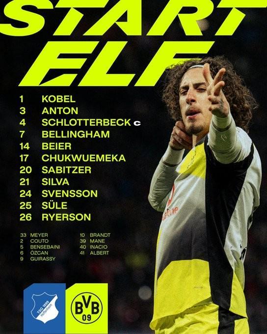 多特蒙德首发:1-科贝尔、3-安东、4-施洛特贝克、7-乔布-贝林厄姆、14-拜尔、17-丘库埃梅卡、20-萨比策、21-法比奥-席尔瓦、24-斯文松、25-聚勒、26-瑞尔森