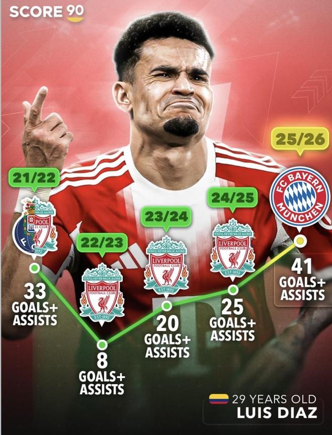迪亚斯在利物浦时期就具备很强的边路冲击力,速度、突破和反抢一直都在,但当时他更多是去完成推进、压迫防线和强行过人的任务。到了拜仁之后,他的这些个人能力被放进了一个更容易转化为进球数据的体系里。拜仁前场的进攻空间更大,边中配合更加流畅,迪亚斯拿球后的选择也更加明确。他不仅能自己内切完成射门,也能在攻防转换中送出关键传球。