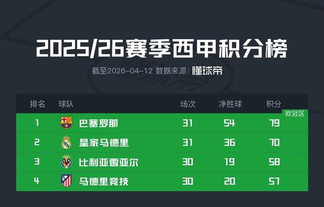 与英超不同的是,巴萨对于皇马的积分领先优势是实实在在地来到了9分。西甲第31轮里,皇马1-1战平赫罗纳,而巴萨4-1笑傲加泰德比,在联赛仅剩7轮的情况下,这已经是很大的领先优势。